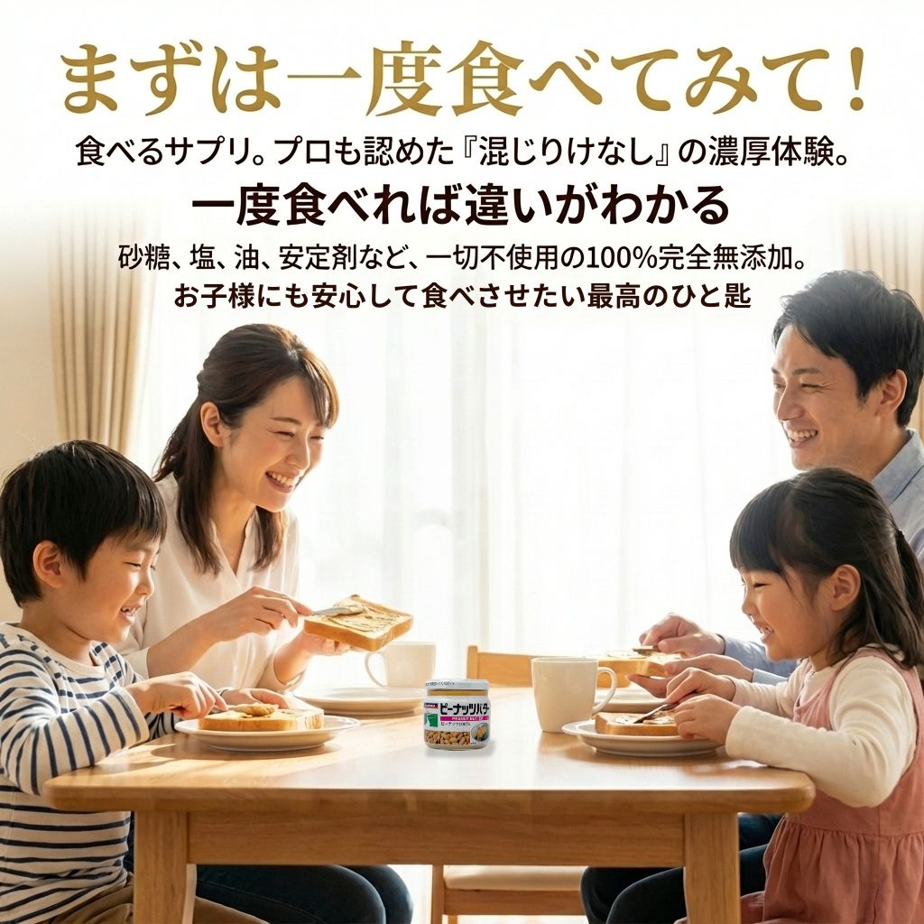 ピーナツ100%です。乳化剤、安定剤、塩、砂糖等は加えていませんので、油が分離する場合があります。
